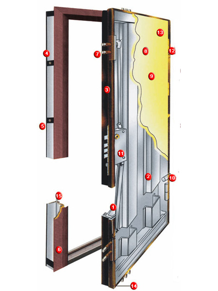 Характеристики: Размери - 197x86, 200x90, 205x96 см.; Панорамна шпионка - 180 градуса ъгъл на обзор; Вграден звънец; Дръжка с вградено осветление; Дебелина на платното на вратата - 70 мм. Конструкцията на платното е изградена от два стоманени листа с дебелина 1 мм, които имат релефна повърхност, получена чрез студена щамповка. Много добра шумо и топлоизолация Прахово боядисани и лакирани; 4 скрити панти. Те осигуряват издържливостта и сигурността на вратата; Тегло 54 - 57 кг. Леви и десни; Отваряеми навън и навътре; Гаранция - 1 година; Легенда: Електропоцинкована метална конструкция Подсилен метален профил Обточваща метална каса Усилена рамка против разбиване Закрепване за стената Подсилена метална каса 15 точки на заключване Студено щампован стоманен лист Стоманен лист от поцинкована ламарина Пасивни шипове Брава Усилена панта Звукоизолиращ слой минерална вата Уплътнителна лента на крилото Звукоизолиращо гумено уплътнение